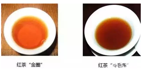 冷后浑、乳凝:红茶汤浓,冷却后出现浅褐色或橙色乳状的浑汤现象,称为冷后浑或乳凝,品质好的红茶出现这种现象。