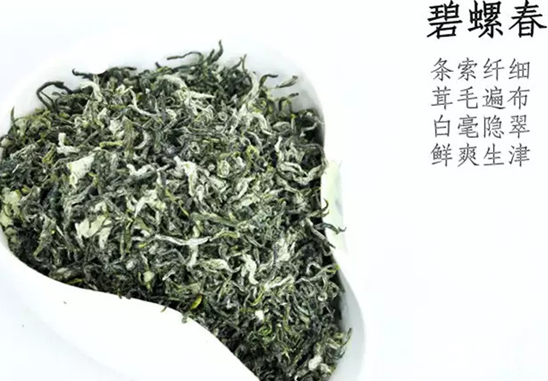 品质特点:条索纤细、卷曲成螺、满身披毫、银白隐翠、清香淡雅、鲜醇甘厚、回味绵长,其汤色碧绿清澈,叶底嫩绿明亮。有"一嫩(芽叶)三鲜"(色、香、味)之称。当地茶农对碧螺春描述为:"铜丝条,螺旋形,浑身毛,花香果味,鲜爽生津。"