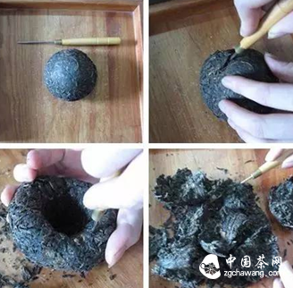 2、将茶针从沱茶的侧面插入,把它分成四等份。