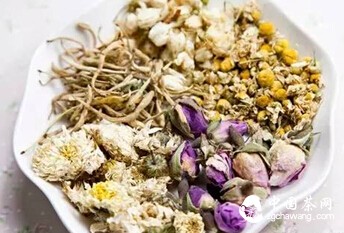 取适量金银花、菊花、槐花、鸡蛋花、木棉花,放到杯中加入开水浸泡即可,能清热解毒、生津止渴、去湿、健胃。