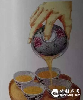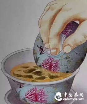 用食指、中指和大拇指拿起盖碗,食指轻压杯盖中间,中指和大拇指齐齐抓住盖杯口边缘,将盖杯提起,使盖杯稍微向前倾斜,徐徐倒茶于小茶杯内。清代亦有不用小茶杯而直接使用盖碗饮茶的方式。
