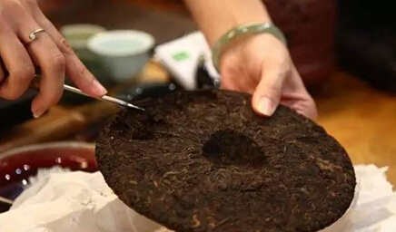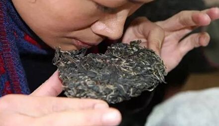 打开绵纸后,把茶饼放到鼻尖,深深对茶哈一口气,然后细细闻10秒钟茶饼茶砖散发的气味。对于熟茶来说,三年以内的多少都还残留冲鼻的堆味,五年以上的则已褪尽。对于生茶而言,新茶清香气重,火烟味也会比老茶重,老生茶则是一种陈香。当然,如果有其他怪味和杂味的话,就说明此茶存放得不好有串味或者是带有霉味的湿仓茶。老茶友则能区别出烘青还是晒青、干仓还是湿仓、甚至出自哪片产区。