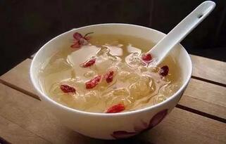 做法:银耳三钱(浸泡),杞子五钱,冰糖适量。将银耳放入锅内,加水适量,煮熟,加入冰糖、杞子,煮沸即成。