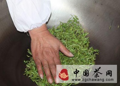 2、锅温(80~100)℃,开始仍用茶把操作,并以把尖先把茶团打散,然后以把尖团揉茶叶,继续“裹揉”,不时挑散,反复进行,约(3~4)min后,茶条进一步紧缩,茶把稍放平,进行“赶条”。待茶条稍紧直,互不相粘时,即用手 “理条”(掌心向下,拇指与食指稍张开成“八”字形,其余三指与食指并拢,稍向内弯曲,成抓东西的虎口状。抓起锅中部分茶叶稍握紧,以抓满手心为宜。