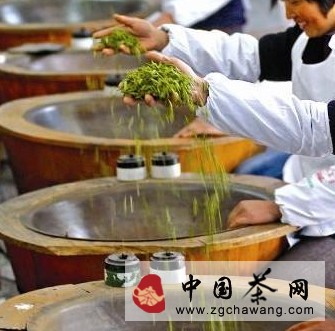 3、等青叶进一步软绵卷缩,初步形成泡松条索,嫩茎折不断,然后尽快将茶叶全部扫入熟锅。生锅历时(7~10)min,茶叶含水率约55% 左右。雨、露水鲜叶,火温提高(10~15)℃,勤翻多抖,嫩叶水分较多,火温稍高,动作宜轻。