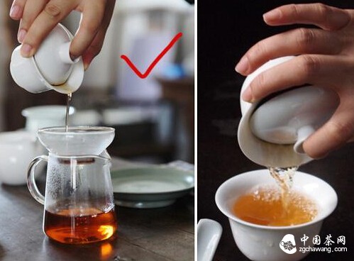 左图拿盖碗的手势不偏不歪,沿着公道杯慢慢向下让茶水缓缓流出。可以很明显的看到茶水并没有触到手。右图拿盖碗明显偏了,茶水也就会沿着斜的位置流水,这样极容易烫到。而且在倒茶时被烫,不得不停下来,稍微停下来,没倒出来的茶水又会重新在盖碗里浸泡茶叶,这时口感就会有所改变。所以正确的拿盖碗倒茶手势就是像左图这样,与公道杯要垂直。别紧张。手指不需要太用力抓着盖碗边缘,越用劲其实越紧张,放松点。大家都是被烫过的过来人,烫几次就习惯了。