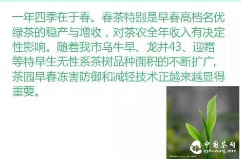 3.喷水洗霜:有水源及喷灌设备的茶园,可利用这些设备,在寒潮来临的当晚,采用喷水洗霜,把附着在茶树芽叶上的霜洗去。