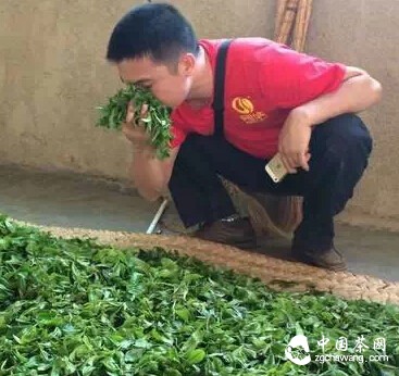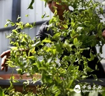 将当天采摘的鲜叶,均匀摊放于萎凋槽中,使其在阴凉通风的环境下,散发水分和青草气,自然完成萎凋。萎凋时间要根据季节、气候、树叶嫩度等因数来决定。完成萎凋的鲜叶,含水量减少,叶片柔软,利于后续手工杀青。没有及时摊开萎凋的鲜叶,会因为自身发酵作用,出现红梗,严重影响毛料质量。