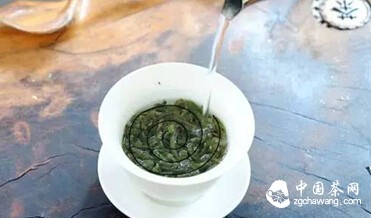 环圈注水顾名思义,指注水时水线沿壶盖或者杯面旋满一周,收水时正好回归出水点。注水时要注意着根据注水速度调整旋转的速度,水柱需细就慢旋,水柱粗就快旋。这样的水线令茶的边缘部份能在第一时间接触到水,而面上中间部份的茶则主要靠水位上涨后才能接触到水,茶水在注水的第一时间溶合度就没那么高。这样的注水方式适合嫩度比较高的绿茶。